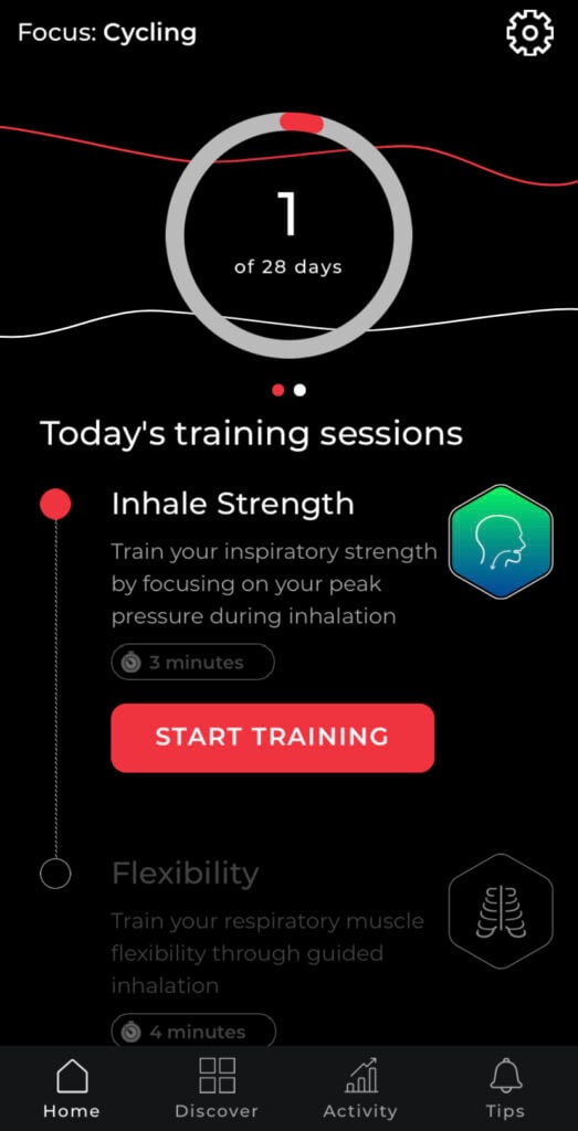 I wasn’t sure what to expect, but the app is very straightforward and after picking cycling as my focus, it automatically enrolled me in a 28-day training program. It includes 2 sessions per day which take about 5-10 minutes and train different aspects of my breathing.